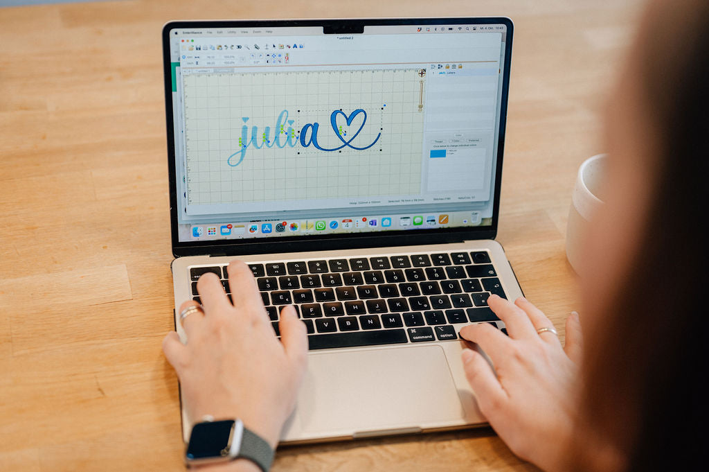 Alles beginnt digital: Jeden Namen erstellen wir in einem speziellen Programm als individuelle Stickdatei. Dabei achten wir darauf, dass das Schriftbild harmonisch wirkt und die Größe perfekt zum Produkt passt. Damit es am Ende genauso aussieht, wie du es dir vorstellst.