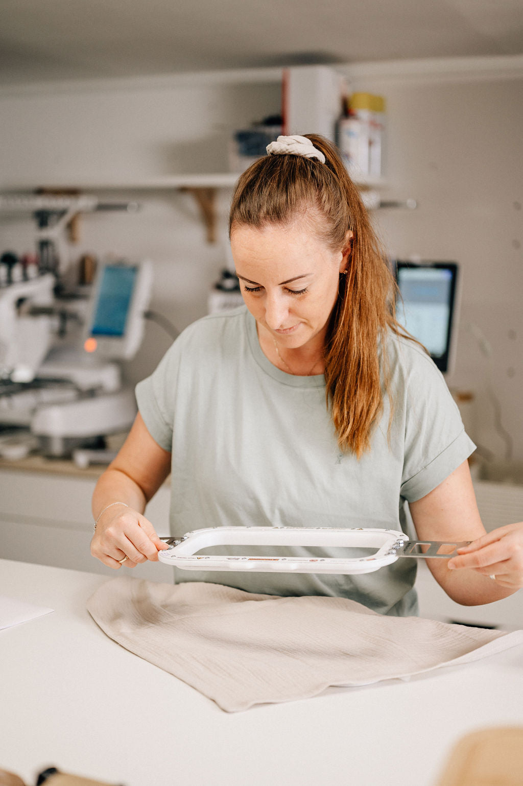 Danach kommt das Handwerk: Wir stabilisieren den Stoff mit Stickvlies und spannen ihn sauber in den Stickrahmen ein. Dieser Schritt ist entscheidend, weil er dafür sorgt, dass die Stickerei gleichmeidig wird und sich der Stoff nicht verzieht.